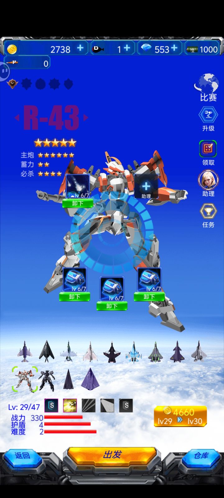 玩的第8天(登录系统为证),密集玩也就三天左右吧目前两架完全体(不用摘装备换来换去那种),T50和大黄蜂歼20和F22没买,试用了觉得一般其他飞机,除了装备的那俩箱子(主要箱子材料没有,钱多的是),也是完全体,战机星级都升完了,所有其他升级也都完了给大家做个攻略,顺便给开发者提些建议游戏不错,主要是战斗机都是现实中的飞机里面“大黄蜂”就是一个BUG(居然还是看广告送的)蓄力攻击近乎无