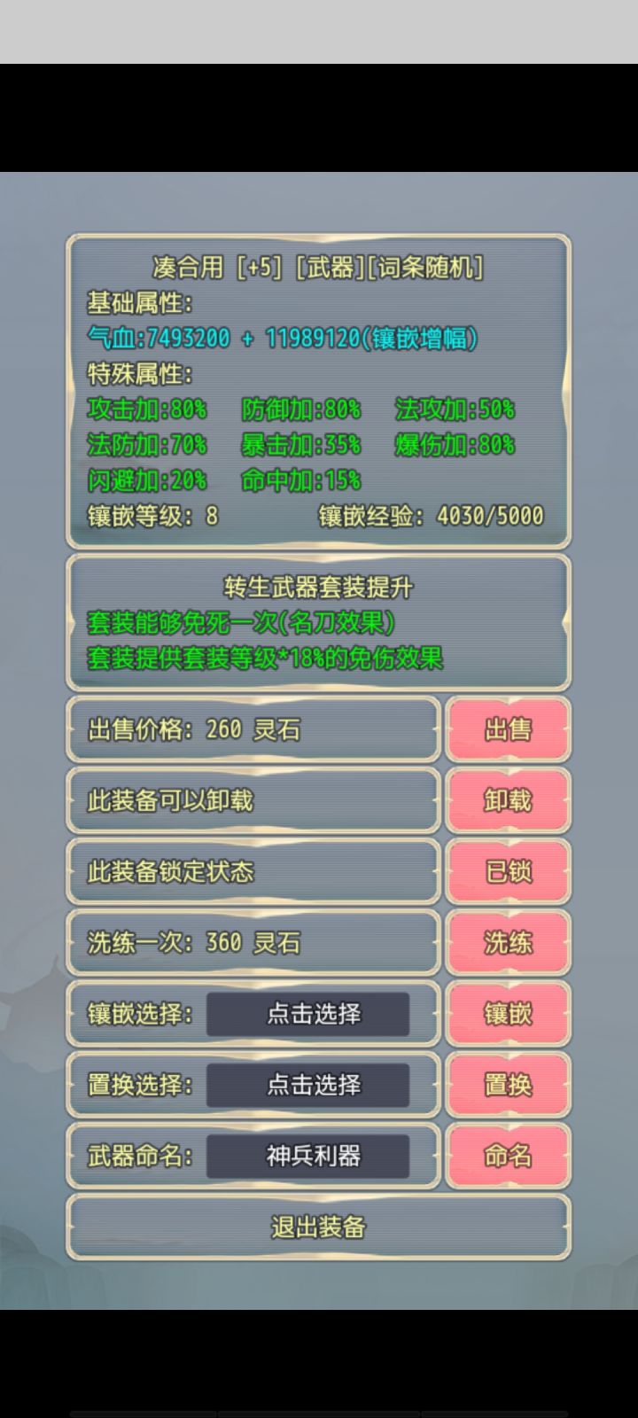 本篇意在说明如何通过装备提升自身属性(这里用的是更新ui之前的图,所以境界名称不同,不用在意)首先我们需要知道,装备受到装备转生等级,镶嵌等级,洗练词条影响,由于后面全部都是宗师装备,我们这里忽略掉装备境界的影响这里我们拆分开来讲装备转生宗师装备可以在炼器房中进行转生,消耗两件同转生等级的装备,可以使主装备的转生等级+1,主装备的镶嵌和词条不变,装备转生+5上限装备转生后,可以使当前的
