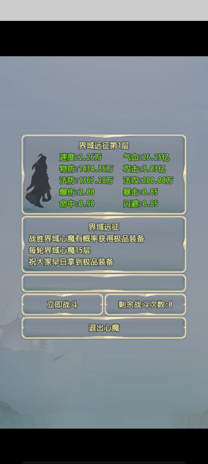 进入方式:主界面,战斗,界域心魔心魔boss属性与自己的属性相同(实时更新),包括丹药加成,法宝属性,法宝技能,转生技能,都是完全一样的心魔boss根据单次伤害排名,每半个小时结算刷新排行榜,每天有五次挑战机会,每日签到后刷新,如果在单次排行内多次挑战,取最高伤害作为排名依据心魔boss奖励如下第一:900灵石15勾玉第二:810灵石13勾玉第三:720灵石12勾玉第4~10:540