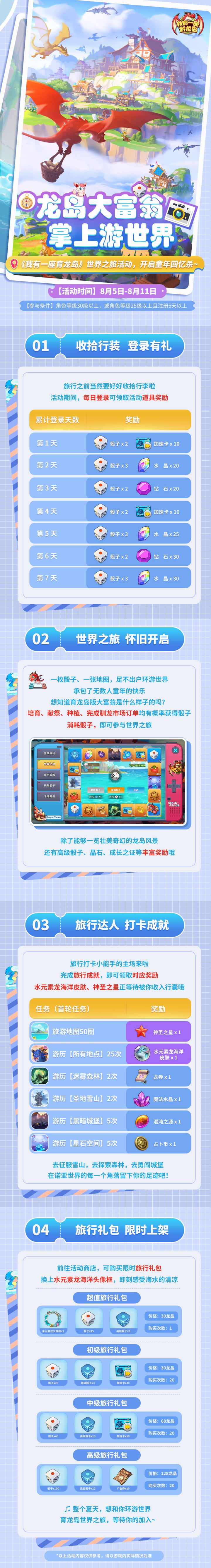 培育、孵化、种植、收获、训练,细水长流的日子里,总是会有一些想要叛逆一次的冲动。于是这一天,驯龙师收拾好了行囊,告别了四季如春的龙岛大本营,进行一场说走就走的环世界之旅......这一路,有神秘的宝藏,也有迷人的风景,积累足够的历练经验,还能解锁成就奖励——去征服雪山,去探索森林,去勇闯城堡,在诺亚世界的每一个角落都留下你的足迹吧!