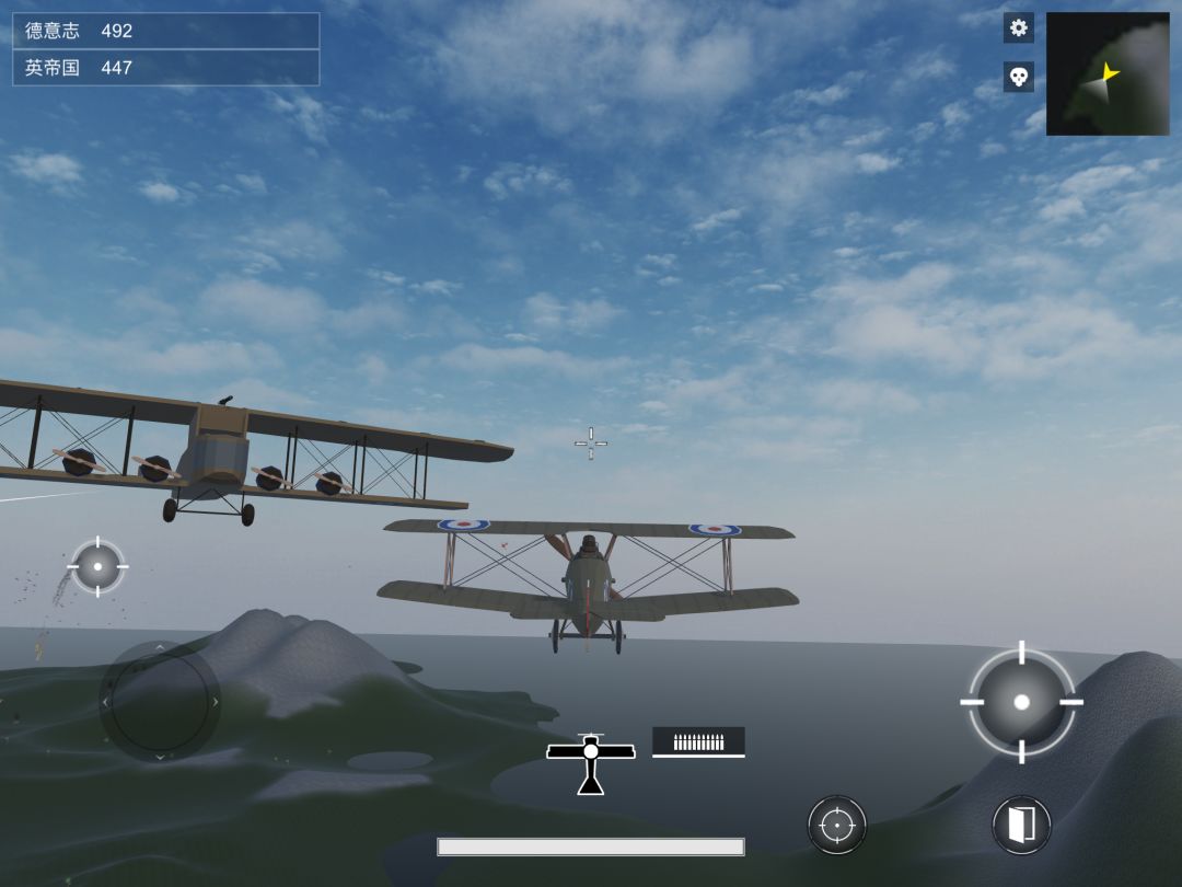1. 三翼机(红色)属德意志,二翼(白色或绿色)属英帝国。 2. 只能朝飞机的行进方向射击,因此用拉杆处理好 航向和瞄准 的关系非常重要。 最稳妥的射击方式是绕到敌机后面追着打,此时视野中敌机位移较小,更容易打中,留给你的射击时间也长,且更为安全。 3. 三翼机比两翼机快,用两翼追三翼会很难受。三翼追两翼要注意别撞上。 4. 瞄准键可以少用。第一,弹道会下坠,瞄准不便于观察弹道以调整射击角度;第二