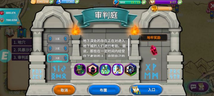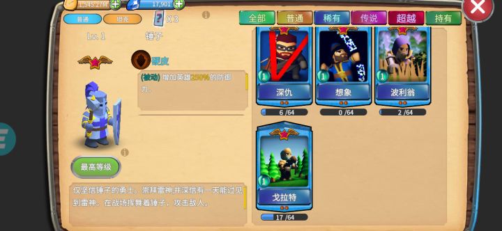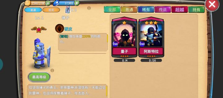 首先这个游戏还没完善 希望各位能够谅解 今天为大家带来的是推层不卡关攻略 首先刷初始(也可以不用) 刷出核心英雄:雷电为止 回蓝神器 钻石全抽50钻英雄传说箱子 因为后期装备合成链远没有英雄的合成链长,且50钻箱子也可以爆装备,已经够用了 前期尽量不升稀有装备(升的话不要超过20层) 闲话不多说,开始说攻略了! 前期上射手雷电 坦克随便上(推荐上大木坠,因为这个英雄有回血技能) 主升雷电(坦克随意