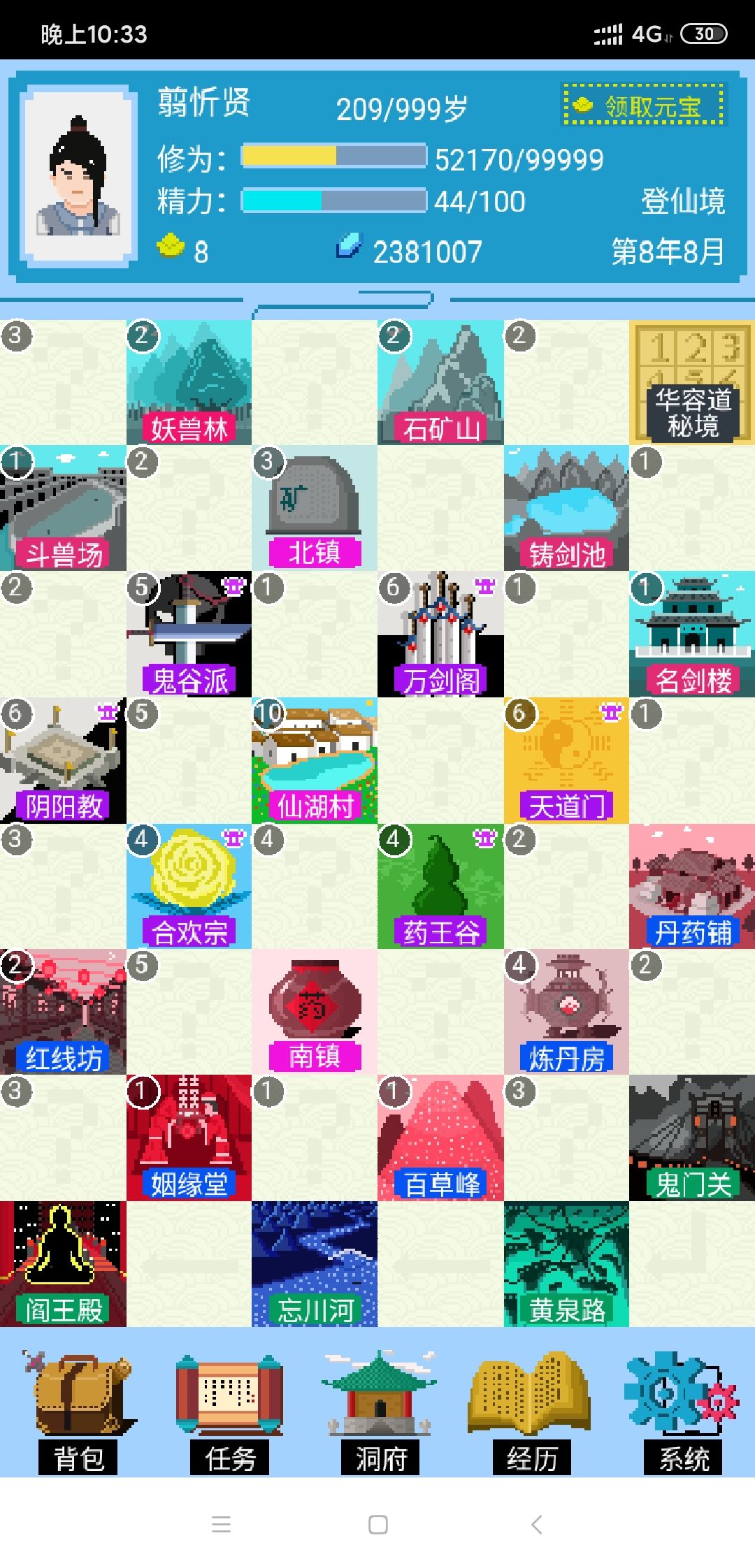 登仙后没有了乐趣 可以一直跳图触发事件获得修为,道德 等级进阶所需资金,可以去兽场倒卖 希望开发更多玩法,总体思路不错