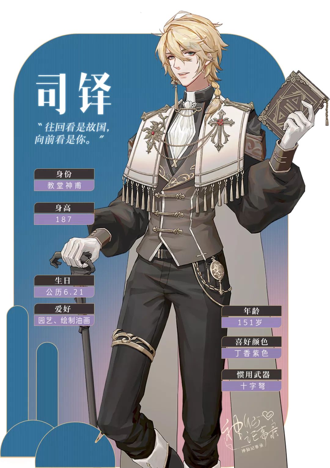 宝贝萌!再提示一遍我们的重磅消息:神仙记事录即将上架TapTap啦!!! 老家聿城也有西洋的教堂, 里面的帅神甫居然也和神仙们是一伙的?! 久等啦,神仙档案第四篇来咯~! 宝贝们一定都很好奇,其他神仙都是咱们聿城本地的, 怎么还有个黄头发帅哥呢? 答案揭晓! 他就是,聿城教堂神甫——司铎! 独自在家的你,想起那次车祸时曾有过一面之缘的他。 各路聿城神仙里,饱含异国风情的他格外抓眼。 他可不是一般的