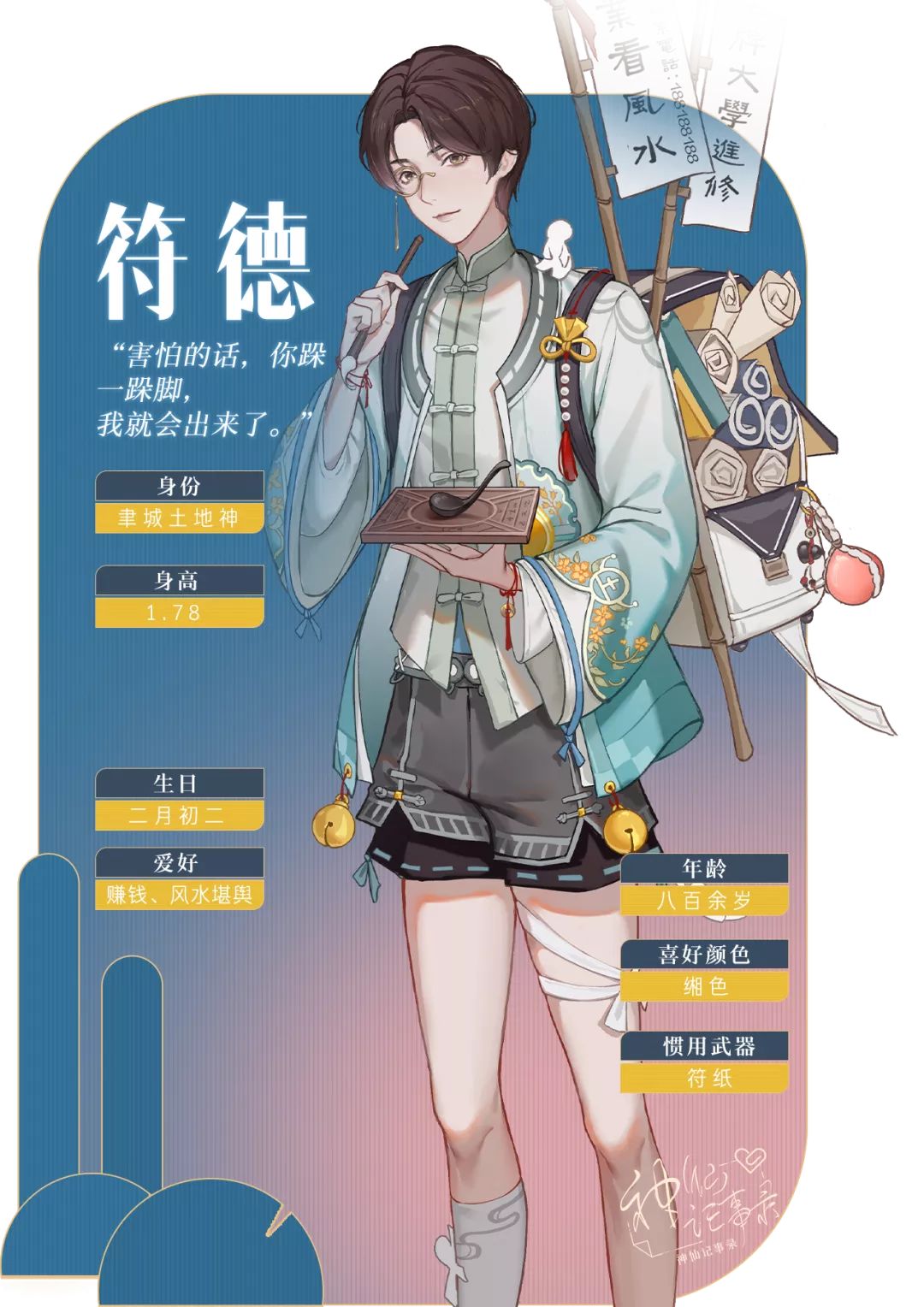 宝贝萌!重磅消息哦:神仙记事录即将上架TapTap啦~ 老家聿城广场上的风水摊子, 居然是本城土地爷摆的! 好耶,神仙档案第三篇来咯~! 今天要来介绍我们的土地神小哥哥啦~ 他就是:聿城土地神——符德! 据说这位土地神~那是奇门遁甲、易经八卦,无所不通! 上知天文下知地理, 简直是最棒的聿城土地爷~ 而你和他的故事也正源于那场意外的“车祸”, 之前说到,神仙们想轮岗照顾你, 这次的人选就是他啦! 就