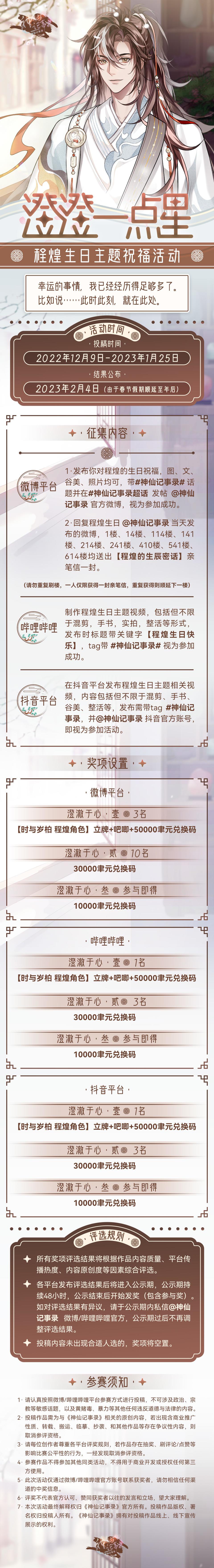 【断善恶】系列程煌生日活动追加说明与奖励展示 解锁古董故事,追踪聿城过往。 活动时间:2023年1月13日18:00版本更新后-2023年2月10日18:00 详细说明见长图↓↓↓↓↓ 神仙记事录聿城: 官方交流6群:398062700 B站:神仙记事录 微博:神仙记事录 抖音:神仙记事录 公众号:拉萌工作室