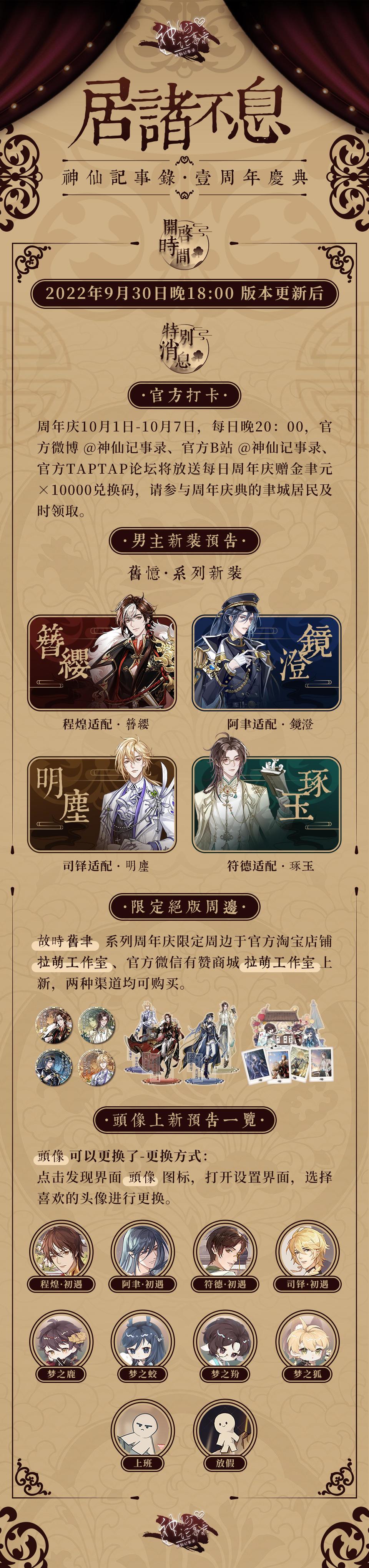 第二弹周年庆情报,10月1日,神仙记事录周年庆版本·居诸不息 —— 【活动说明】: 于本帖评论区回复您对聿城周年庆的期待,10月1日周年庆当天,将抽取5位聿城居民获得聿元*50000的周年庆兑换码礼包! 【具体版本情报戳下面长图】👇👇👇 神仙记事录聿城: 官方交流4群:568455074 B站:神仙记事录 微博:神仙记事录 抖音:神仙记事录 公众号:拉萌工作室 ==================