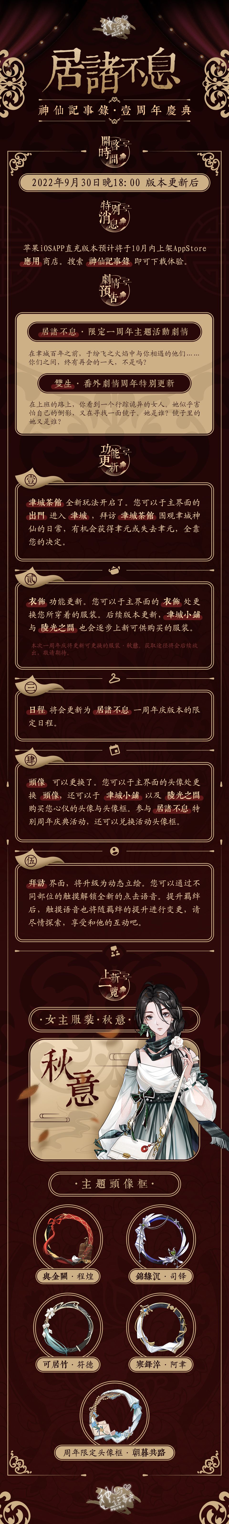 【特别提示】: 【居诸不息】神仙记事录一周年庆,10月1日与你相约❤ 主线剧情: 和天后娘娘分别之后,你来到了之前联系过的“他”的地方。这个新家,也许是你和“他”新的开始…… 本周《神仙记事录》更新 主线章节: 《事事平安》 《保持联系》 《闲杂事》 《做客》 【功能&活动更新通知】 ·【番外剧情】不需要点进男主单独界面啦! 在主界面点击【约会】即可查看自己已解锁的全部番外剧情。 ·【头像】