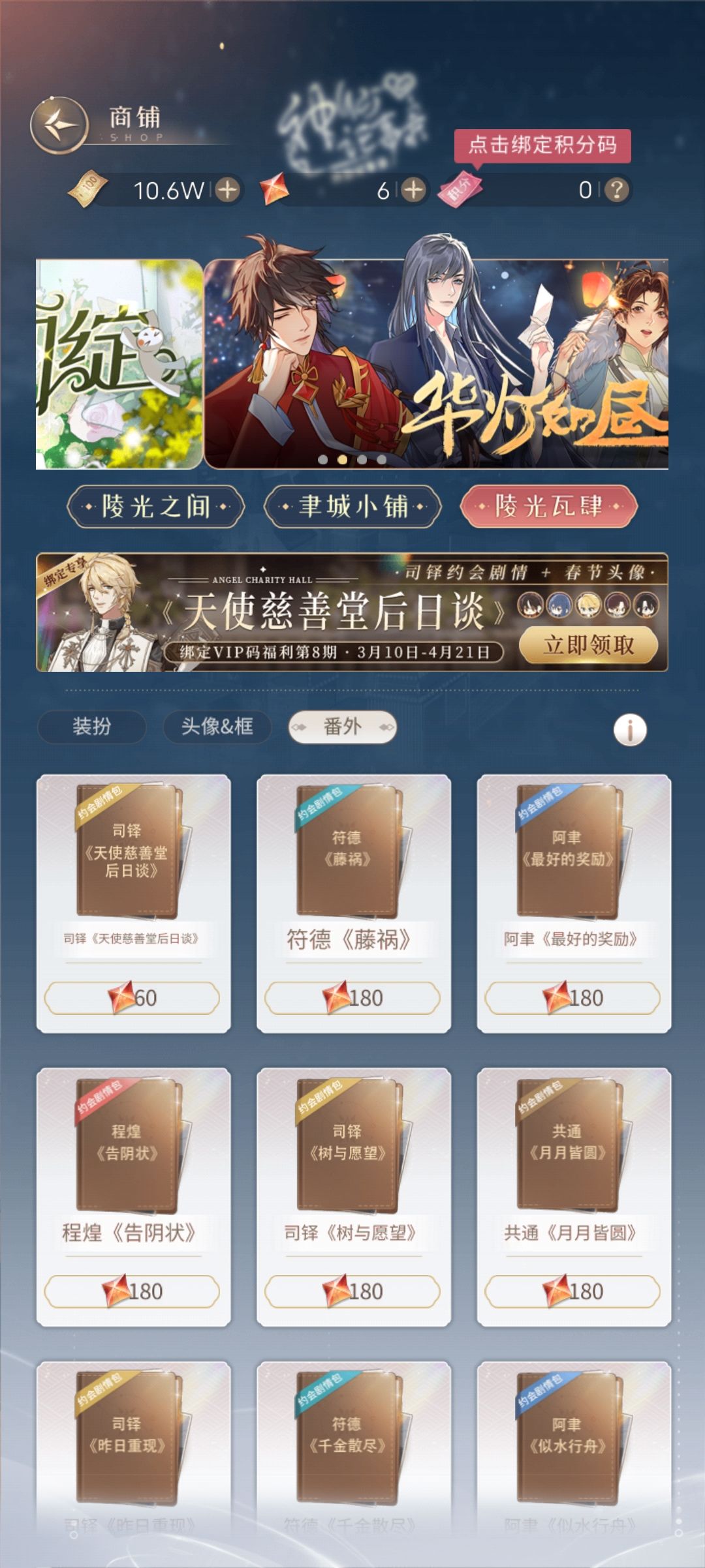 关于最新上的陵光石,它的主要是作用可以换取,以前咱们是已经过了获得时间的一些番外,(在当时是用绑定VIP码获取番外),现在可以用陵光石来换 陵光石的获取方式有如图两种,完成每日待办,每天最多获取五个,或者充值(购买周边即可获得积分)用积分来换