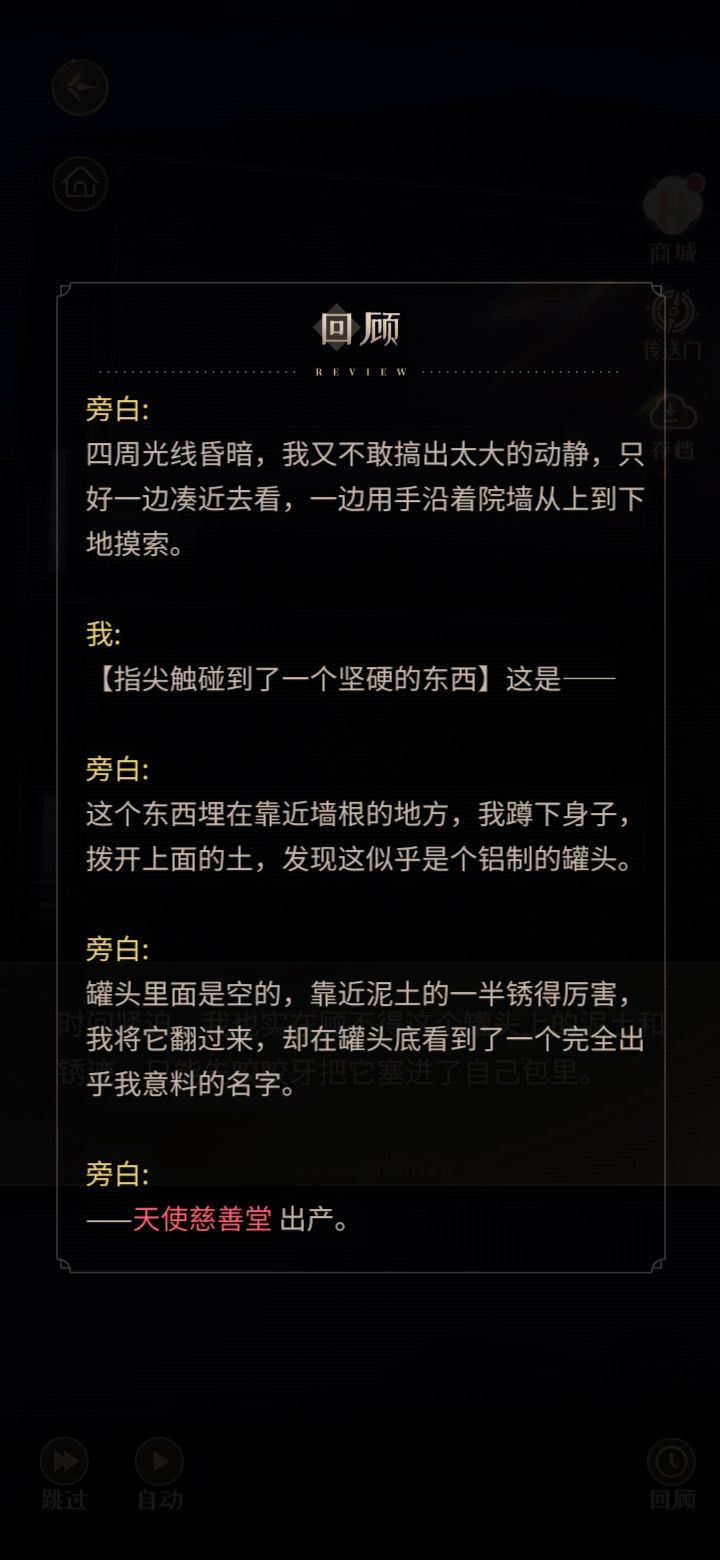 第六章林城河神选“立刻回去”第九章暗道会想起城南尾巷的罐头,选“先去找阿聿”不会想起城南尾巷,怎么藏这么深,不知道我漏了多少剧情。还有女主说想起什么哪里见过,我什么也想不起来。 P1 第六章 河神 立刻回去 P2-3 第九章 暗道 选“立刻回去” P4 第九章 暗道 选“先去找阿聿”