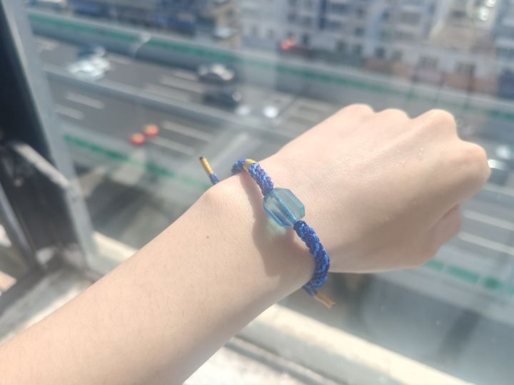 很久以前想做,但是一直懒得搞,前两天看到pdd里面卖三五十,使用的材料还是海蓝宝随形,感觉同等价格不如自己手编,于是编了一下,顺便简单描述一下教程。如果对于教程中提到的编法有不理解或认为可优化之处,欢迎评论。材料:海蓝宝/琉璃 桶珠/随形 72号玉线(深蓝色与天蓝色两种) 三股金线编法:两根72号玉线/其他合适的线作为轴线,挂2根深蓝玉线+1根天蓝玉线,建议轴线长度为手围2倍,挂线长度为轴