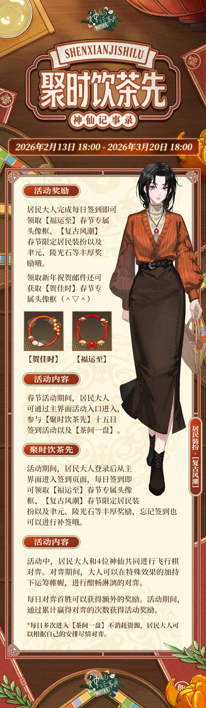 ➤活动即将开启,居民大人完成每日签到即可领取【福运至】春节专属头像框、【复古风潮】春节限定居民装扮以及聿元、陵光石等丰厚奖励哦。领取新年祝贺邮件还可获取【贺佳时】春节专属头像框(^▽^) 聚时饮茶先·春节活动情报发布情报详见长图↓神仙记事录聿城:官方交流9群:916876616B站:神仙记事录微博:神仙记事录抖音:神仙记事录公众号:拉萌工作室
