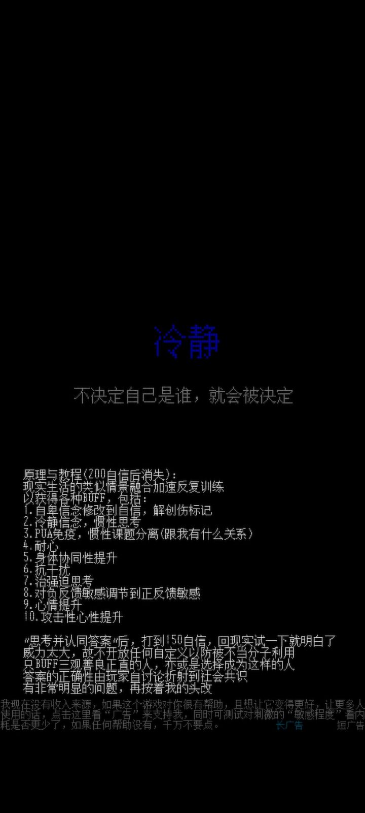 评论区我就不一个个回复了. 无论是新老玩家,不同人,态度如何,想必已经明确的知道,这是一个"刺激"且对人影响巨大的游戏. 我说过是"改变命运"这种层度,所以这是必然的.不是什么"轻量级",心情愉悦,装看不见就能打随意打打的"娱乐"的东西.不如说,请务必以"动手术"的心情面对. 对于"和我差不多"的人,会像"吃饭"一样轻松,并感到爽快.或许会找到异性朋友,走出抑郁也说不一定. 而对于另一些玩家 则是:是否要推翻过去?是不是很危险?我是否被包容? 我的态度是"包容". 因为人是一样的.我如果不以包容谅解的态度面对你,我也会和脑子里的声音冲突而精神分裂. 不过面对恐惧的过程我不能代替你.我不能做得"一点感觉也没有""温和简单" ,那样就"没有意义了" 它是游戏,而非现实,就已经是我最大的善意.