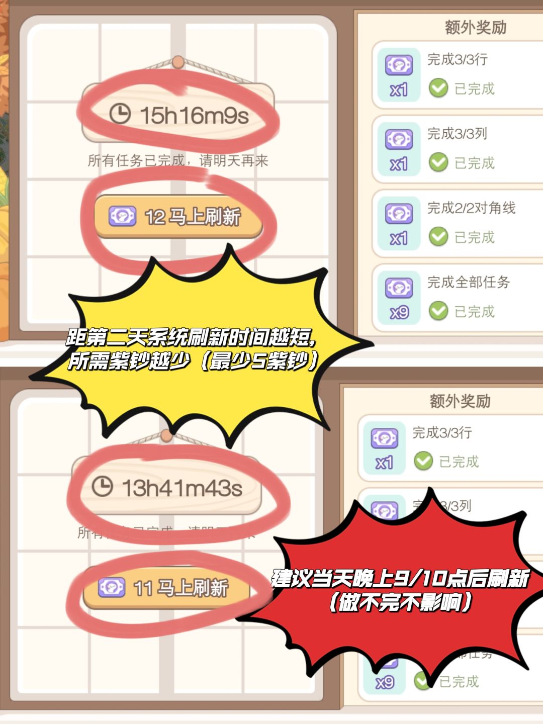 活动共9天 47×9=423紫钞:每天2次任务(减去刷新5钞) 240紫钞:梦幻钱箱小游戏(第一次合成5~20号硬币,之后再合成就没有紫钞只有金币奖励了!). 5×9=45紫钞:每天领感恩祝福5钞 九天总共可以获得240+45+423=708紫钞 另外: 如每天买6元超惠礼包:20×9=180紫钞 海岛大赛:按照一个海岛有50票计算(好好装修一般有50票左右),按自己拥有的海岛数量计算#攻略#梦幻的城