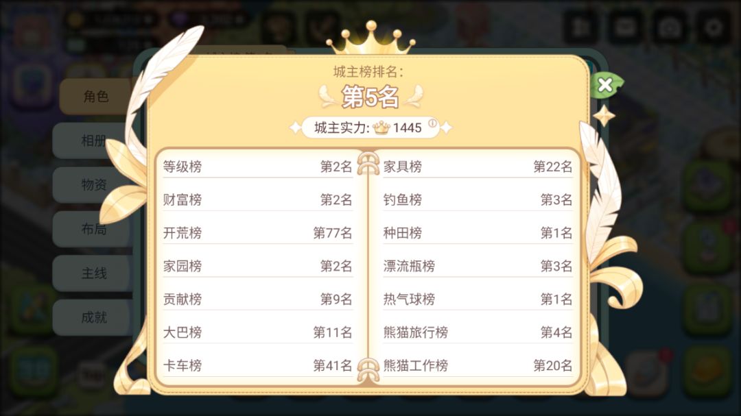 小氪玩家。(昨天没怎么玩,排名有点低) 这几天建议玩家多做做漂流瓶,金币建筑值等翻倍。部分漂流瓶需要材料多的直接丢弃,等刷新。 钻石我是用来抽卡了,动物升级也蛮重要的。(动物升级,组建家庭,之后会有小孩,一家三口要做任务)要么用来冲等级。 热气球在卡材料卡金币的时候做。 缺金币有以下几种获取方式: 1、在各类作坊里,点仓库卖钱(但很亏) 2、卖鱼 3、漂流瓶>装货>热气球>装备熊猫旅游 4、每天比