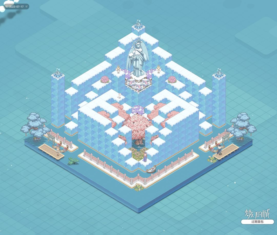 #梦幻的城布局大赛# 改了那个冰立方大台阶的模板,做成了类似天使花神神殿一样的效果(目移)地基如P2。 总的来说由五个部分组成。 1.冰墙和冰柱。 冰墙就是背景那片墙,冰柱在两边各有一根,最顶端都用那个冰花盖了尖儿。 值得一提的是,我后面放了两只萨拉曼德,但位置是随机的,如果有被随机到冰墙上的,它就会毅然决然地爬到最高的那一朵冰花上坐着……在花神像的头顶上……然后就不下来了……哎呀,小六角龙能有