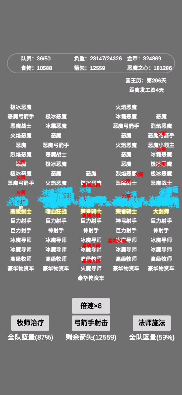 开始可以看几发广告,拿点金币,然后买前排的剑士,后排是牧师(加血,高级的套盾)和物资车(携带食物和弓箭的数量)中间输出法师和弓手买点就可以起飞了小型恶魔城10层 10层boss有3w恶魔之心(恶魔之心回城后换算成金币)打通中型恶魔城30层 好像是15w恶魔之心吧 忘了恶魔首都是100层,我只打到10层!出城带上军粮(食物)和军饷(金币)粮食是前进会消耗和休整会消耗,每过一天可以回血和蓝,每30天扣军饷,带足金币吧,不然会有惊喜!!!有钱了就买买买就完事了!配张图!