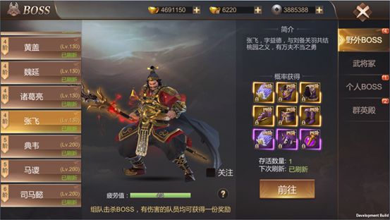 Boss系统130级开启,挑战boss可以获得更高级的装备,迅速提升战斗力野外boss:1. 击杀野外boss需要消耗疲劳值,在击杀时需要注意防止其他玩家抢夺;2. 疲劳值8小时恢复1点,也可以使用道具立即获得疲劳值3. 野外boss被击杀后,一定时间后才会重新刷新,越高级boss刷新时间越久个人boss:1. 个人boss只能单人击杀2. 每次进入消耗挑战券3. 提升vip等级可