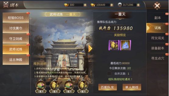 在游戏主界面左上角的图标中点击每日挑战即可进入副本界面,然后选择试炼即可找到武将试炼。武将试炼玩法说明武将试炼共分为15重天,每通过一重天即可挑战下一重天,每重天里面包含5个BOSS,只有在限定的时间内击杀完BOSS才能完成挑战。规则:1、 武将试炼每重天共有5关BOSS挑战2、 每关挑战在限定的时间内未能击杀BOSS,则通关失败3、 全部通过后且达到最低战力要求之后即可挑战更高重天奖