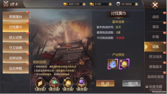 在游戏主界面左上角的图标中点击每日挑战即可进入副本界面,然后选择试炼即可找到讨伐黄巾。讨伐黄巾玩法说明当进入副本之后,会刷新怪物,当击杀完一波怪物之后会刷新下一波的怪物,尽可能的阻止怪物进入传送点,当一定数量的怪物进入传送点后,则副本失败。规则说明:1、 怪物刷新后,需要在怪物移动传送点前击杀2、 如逃走的怪物达到一定的数量则本关失败3、 守住的波数越多,获得的奖励越多奖励:1、 每