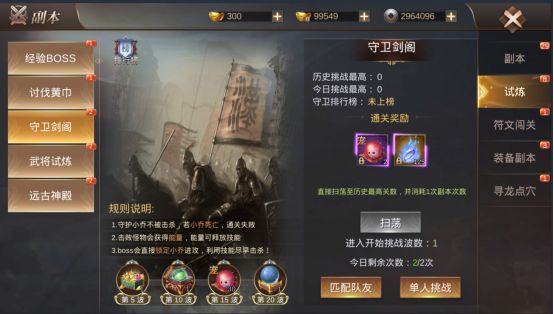 在游戏主界面左上角的图标中点击每日挑战即可进入副本界面,然后选择试炼即可找到守卫剑阁。守卫剑阁玩法说明进入副本之后,需要保护林依依不被攻击,当林依依的血量达到0之后则守护失败。当守护的波数越多,获得的奖励越高。规则:1、 守护林依依不被击杀,若林依依死亡,通关失败,2、 击败怪物可以获得能量,能量可以释放技能,3、 BOSS会直接锁定林依依进攻,利用技能尽早击杀BOSS。奖励:1、
