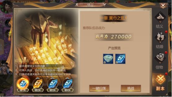 结义副本:1、 结义副本可单人挑战,可以邀请与自己结义的伙伴一起挑战2、 结义副本进度结义伙伴共享3、 扫荡或者通关结义副本获得奖励时,会分享奖励给其他结义伙伴4、 首次通关关卡可以领取通关奖励,该奖励无法重复获得