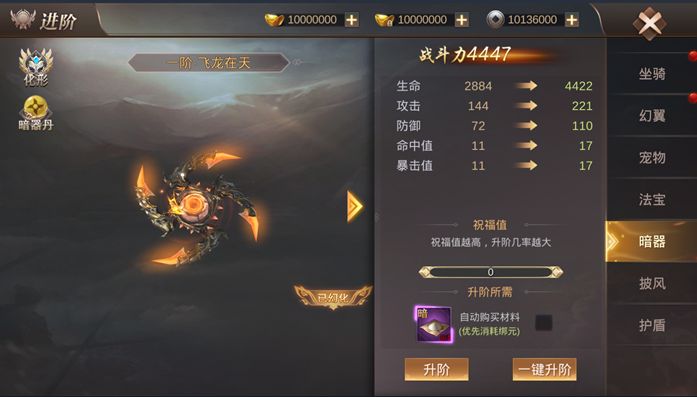 《霸御乾坤》游戏中拥有十余种精致特别的暗器,进阶暗器即可获得相应的战力加成,每次培养升阶还可以为我们带来生命、攻击、防御、忽略闪避、暴击值属性上的加强。暗器进阶1.暗器激活后才能进阶,除福利升级奖励以外,通过“主线副本”“经验副本”“暗器副本”“白银宝箱”都可获得进阶材料;2.暗器进阶消耗一定数量的暗器进阶石,暗器副本产出大量进阶石;3.暗器进阶成功后,不仅能提升人物属性,还能获得特定暗器外