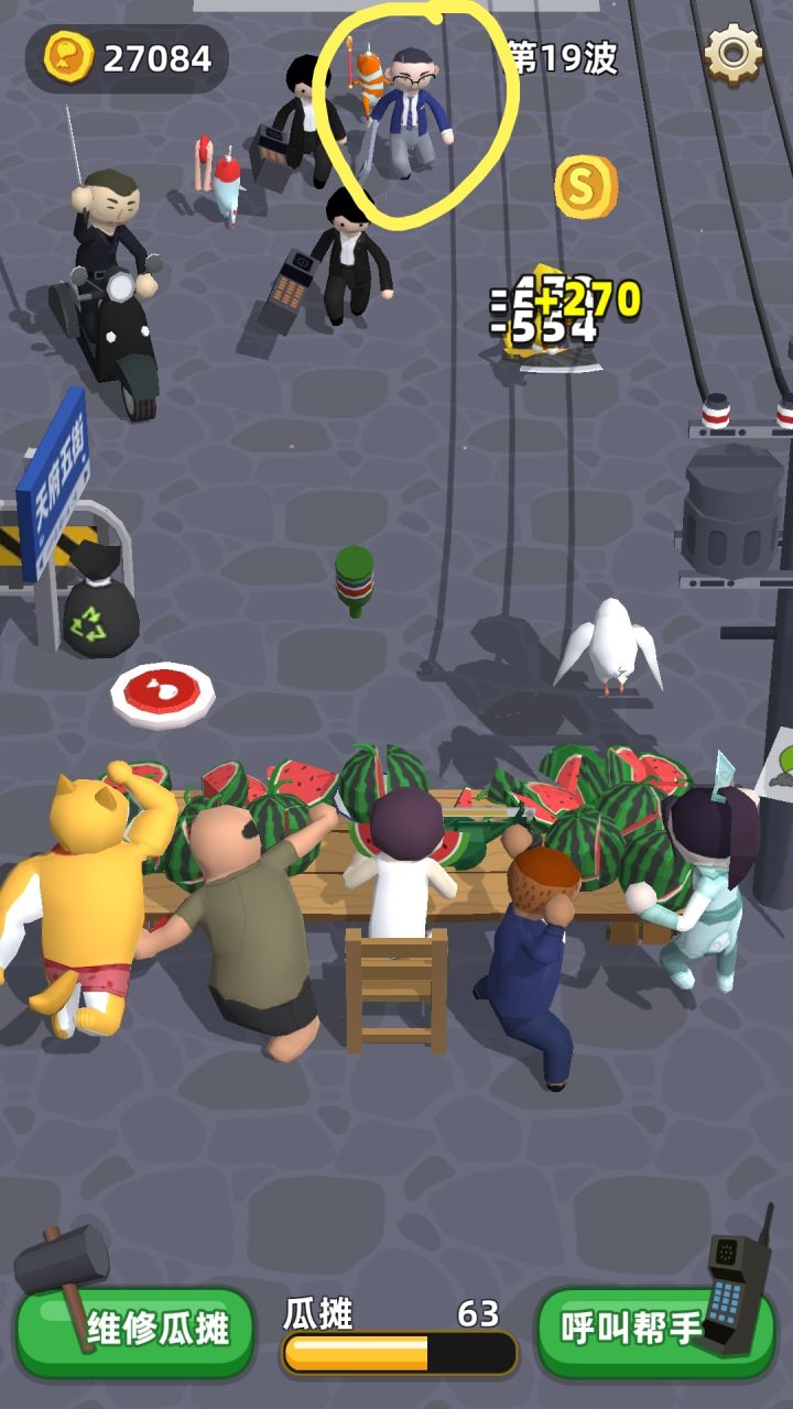这游戏挺魔性的,玩了一个多小时了都,研究了下阵容,第一第二个买剑圣或飞机女孩,第三个第四个选撒币土豪和飞盘狗,,前期攒钱卖人三人口后升飞机女,伤害不高但攻速快啊,然后升撒币土豪,附加攻击对西瓜摊主和飞机女孩都有加成,为啥选剑圣和狗不选水枪熊孩子和扔瓶子大叔是因为我有强迫症,剑圣纵向攻击狗子横向攻击而且AOE距离选伤害还高,对移速快的小怪都是秒杀,这个阵容摊主一般吃瓜很少战斗可以看到攻速很高伤害受