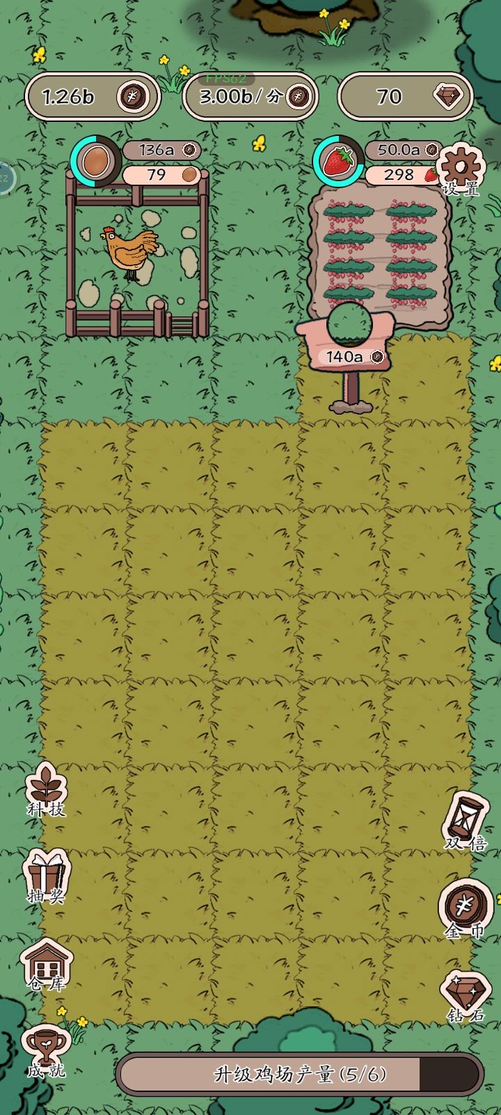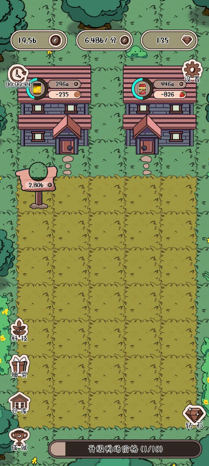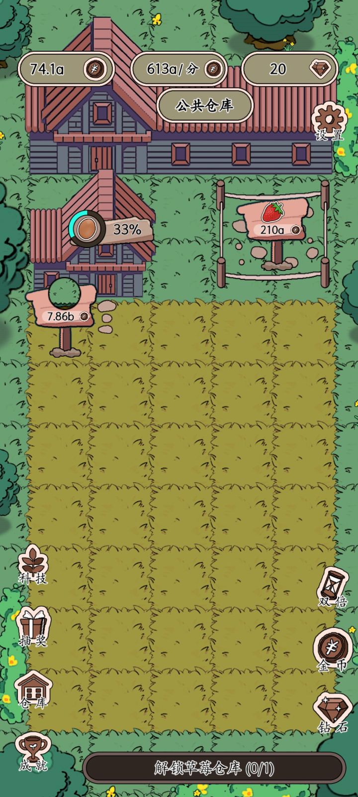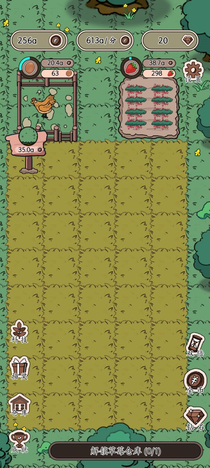 开局一个养鸡场,后面的慢慢建任务很简单。就等鸡鸭草莓等等赚钱,然后增加产量增加产品的价格,之后解锁场地,修建工厂仓库,然后又是增加产量增加价格,游戏很简单,无聊的时候可以打发时间右边的几个是看广告获得额外币的,左边没研究这个游戏整体来说可以,画风简单可爱,这个游戏界面也不复杂,色彩搭配也很让人舒服