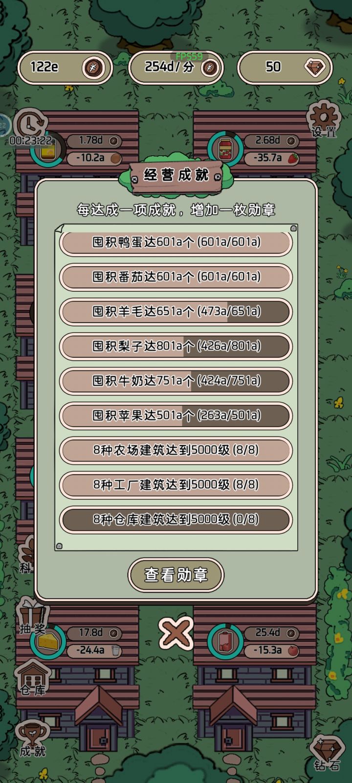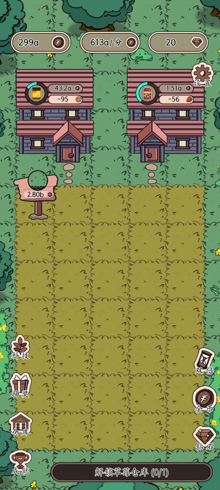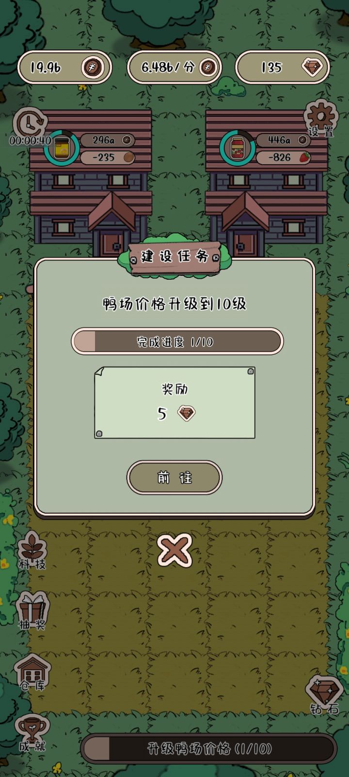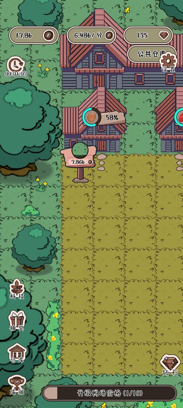 开局一个养鸡场,后面的慢慢建任务很简单。就等鸡鸭草莓等等赚钱,然后增加产量增加产品的价格,之后解锁场地,修建工厂仓库,然后又是增加产量增加价格,游戏很简单,无聊的时候可以打发时间右边的几个是看广告获得额外币的,左边没研究这个游戏整体来说可以,画风简单可爱,这个游戏界面也不复杂,色彩搭配也很让人舒服