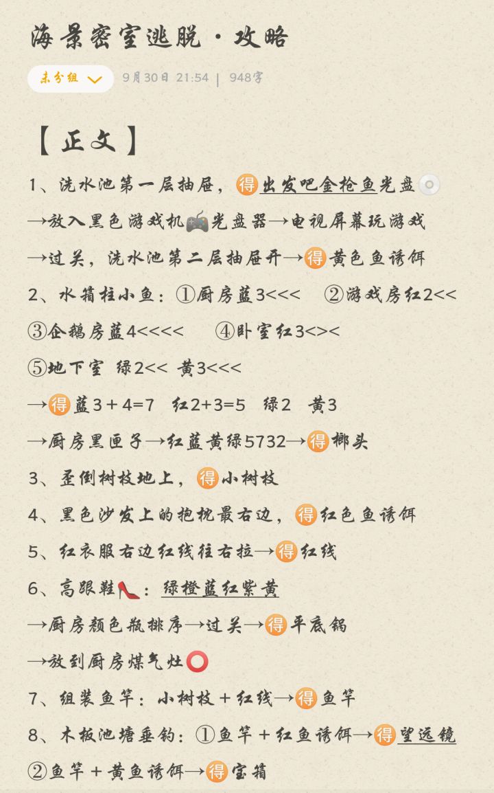 啦啦啦~小伙伴们是否都见过蔚蓝的大海呢?海天一色,碧浪穿空。是否见过海浪轻打石壁,海风拂起浪花,海鸥飞越过海面伴随着声声鸣叫。思绪仿佛也随着海鸥飞向远方。一切的场景都显得那么的宁静祥和。但是!你,也就是本作的主角。居然深陷囹圄,被困在这栋孤独漂浮在海面上的海景别墅中。别墅中空无一人,也没有任何食物。你该如何才能从这间密室中安全逃脱呢?就看你的脑洞够不够大,是否善于发