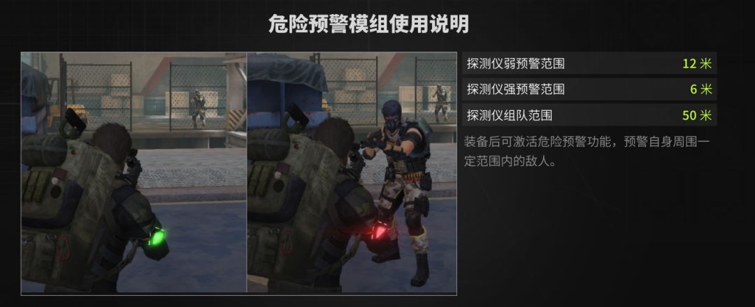 模组说明:装备后可激活危险预警功能,预警自身周围一定范围内的敌人。 模组情况:探测仪弱预警范围12米;探测仪强预警范围6米;探测仪组队范围50 米 探查说明:探测仪弱预警范围——敌人进入该范围时,警报灯变成红色; 探测仪强预警范围——敌人进入该范围时,警报灯变成红色并开始闪烁; 探测仪组队范围——其他萤火虫进入该范围时,可以接受到组队的友好信号