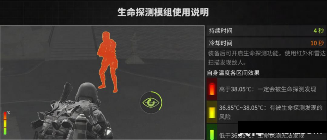 模组说明:装备后可开启生命探测功能,使用红外和雷达扫描发现敌人。 模组情况: