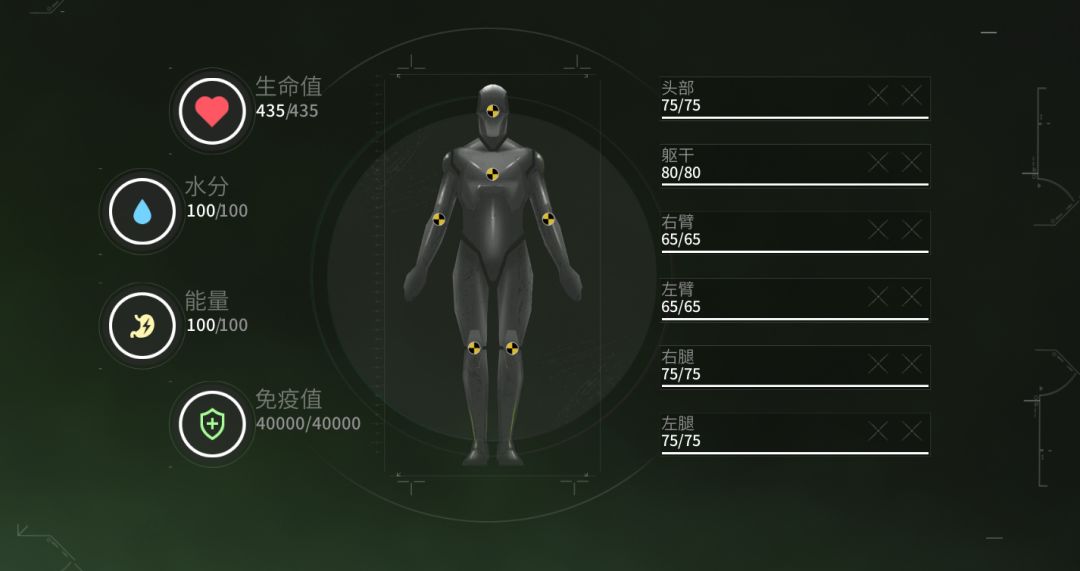 敌人打不过,自己总倒地?玩的晕晕乎乎,不了解具体数据,哪些枪械好,哪些子弹伤害高,是不是看的眼花缭乱?本期萤火攻略团将为各位萤火虫总结你需要了解的数值机制,让各位萤火虫有的放矢,临危不乱! 一:血量机制数值 1:血量数值 萤火虫的血量共有435点,对手命中躯干、四肢、头部时伤害不同。可以在健康中心查看身体各部位的情况。BOSS的血量要高一些,因此对抗游荡者首领并不像与萤火虫对战一样。在避难所时