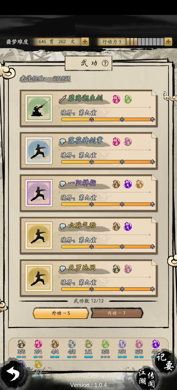 桃花4,破招2,幽墓3,刚猛3,全真2,调息2,玄阴2,江湖1,纯阳2,灵动3,华山3,御气2,千变3,丐帮2,擒拿3,明教2,反击2,突袭2。