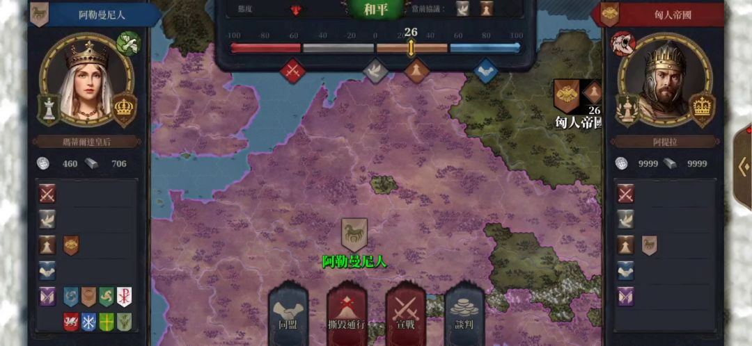 此次《欧陆战争7:中世纪》将首次尝试不可定阵营模式,没有固定的阵营,取而代之的是不同势力之间的外交关系,各国之间亦敌亦友。你宣战的国家可能背后有盟友援助,而你刚结交的盟友可能下回合又被其他国家拉走。 本作外交关系将分为:战争、和平、通行、同盟。游戏内玩家所选国家与其他国家的外交关系会以外交关系图标、外交值、外交态度的形式直接显示在大地图上,玩家可以更直观、更快捷的思考采取何种外交政策。 外交值作为