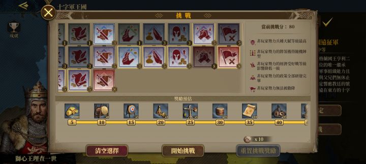 t0:理查,贞德,穿刺公,查理曼t1:李靖,麻风王,耶律大石,亚瑟t2:高仙芝,约翰一世,成吉思汗,匈雅提,威廉t3:阿福,亚历山大,迪努瓦,穆2,斯特凡t4:爱1,爱3,罗兰,巴巴罗萨,巴耶济德t5:阿莱克修斯,兰斯洛特,哈立德