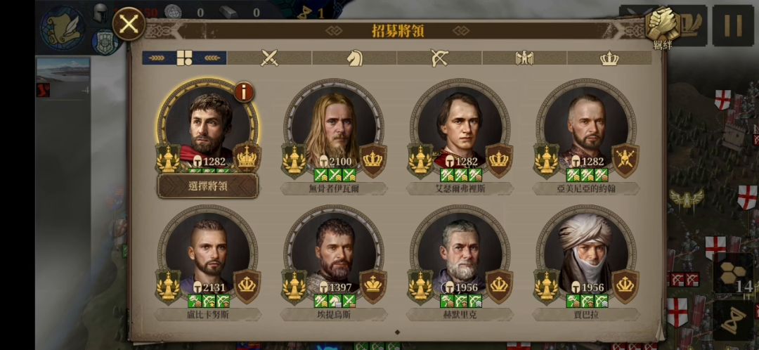 t0:理查,贞德,穿刺公,查理曼t1:李靖,麻风王,耶律大石,亚瑟t2:高仙芝,约翰一世,成吉思汗,匈雅提,威廉t3:阿福,亚历山大,迪努瓦,穆2,斯特凡t4:爱1,爱3,罗兰,巴巴罗萨,巴耶济德t5:阿莱克修斯,兰斯洛特,哈立德