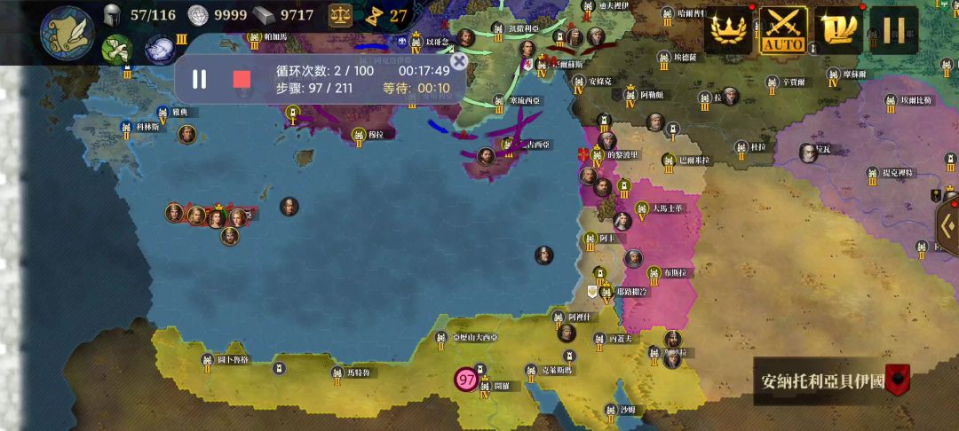 视频开头是过回合后结盟的操作:图中97-100步骤记得按慢点,中间隔个几秒钟吧,要不然容易出错就没法循环上了。结盟顺序跟视频的一样就行,从倒数第二个开始结盟,记得多预留出3个通行国结盟的操作(因为那3小国有时候会被灭)结盟除最后一个阿尤布王国时,记得点几下海,清除上面额外通行国结盟的操作可能导致的页面不是初始大地图页面的问题结盟阿尤布王国后胜利结算的按钮也要慢按,多隔几秒,要不然容易接不上下一个循环后面从步骤1-97的其实都很简单,看着操作就行了,新手建议先按着这个步骤把这部分操作好了,这部分学会后就能半自动刷挑征了,后面再慢慢摸索结盟的事。