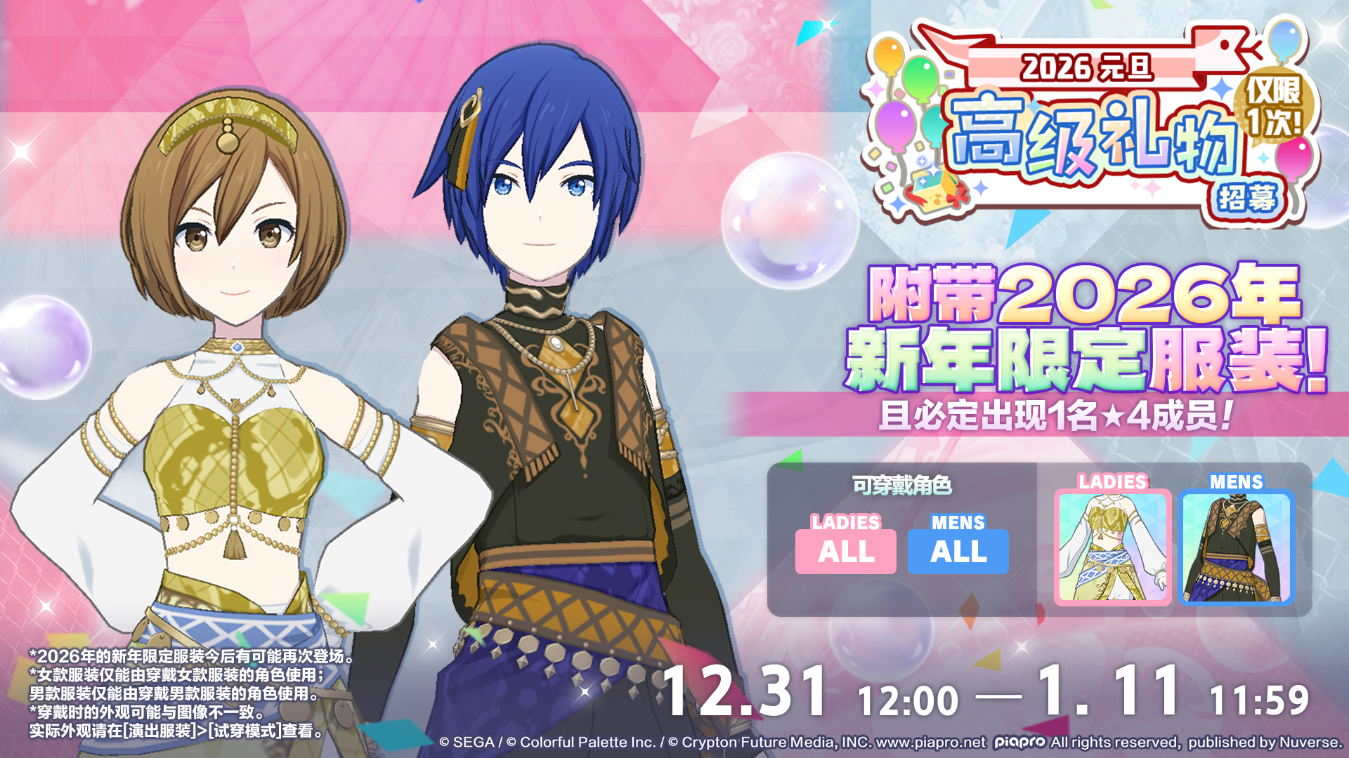 尊敬的各位「世界」居民:我们将于12/31 12:00起将举办「[2026元旦]高级礼物招募」!“[2026元旦]高级礼物招募”必定出现★2及以上成员,且必定出现1名★4成员。另外,会附带2026元旦的限定服装“丰收的肚皮舞娘”、“生命的肚皮舞者”套装。本招募为每人限定一次,可使用付费水晶×3000进行招募💕※详情请至游戏内通知查看。今后也请多多支持《初音未来:缤纷舞台》!立即前往「
