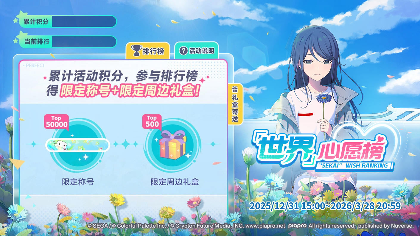 尊敬的各位「世界」居民:感谢各位居民对《初音未来:缤纷舞台》的支持。为了给居民带来更多元化的游戏体验,我们将定期举办「世界」心愿榜活动。「世界」心愿榜(第二期)将于12月31日 15:00起开启。在各剧情活动统计周期内游玩「单人演出」、「多人演出」、「挑战演出」、「排位赛」及「我的「世界」玩法」,所获得的活动积分将全部计入「世界」心愿榜。「世界」心愿榜活动结束后,将根据综合排名顺序获得相应