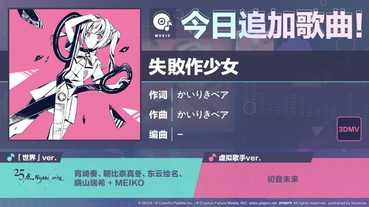 尊敬的各位「世界」居民:感谢各位居民对《初音未来:缤纷舞台》的支持。4/21 15:00起,追加歌曲《失敗作少女》!可以在现实世界的「音乐商店」兑换追加的歌曲。■歌曲介绍《失敗作少女》作词:かいりきベア作曲:かいりきベア编曲:-歌手虚拟歌手ver.:初音未来(Original CV by 藤田咲)「世界」ver.:MEIKO(Original CV by 拜乡芽衣子)、宵崎奏
