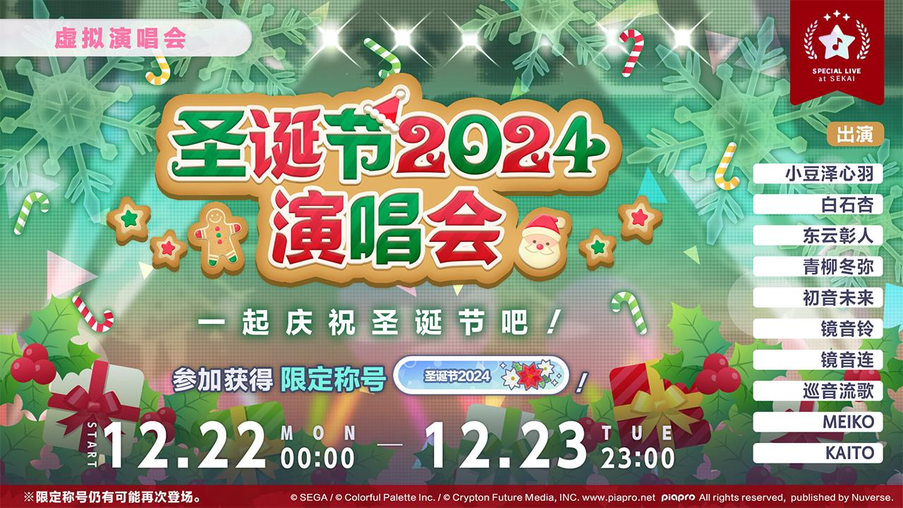 尊敬的各位「世界」居民:我们将于12/22(一)和12/23(二)举办「圣诞节2024 演唱会」。将会由Vivid BAD SQUAD与六位虚拟歌手共同为大家带来精彩演出✨【场次及开放时间】12/22、12/2300:00、01:00、02:00、08:00、12:0018:00、19:00、20:00、21:00、22:00、23:00欢迎各位居民前往观看,一起庆祝圣诞节吧!祝愿