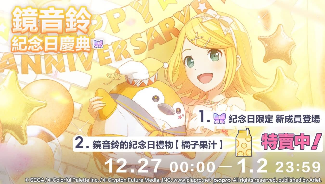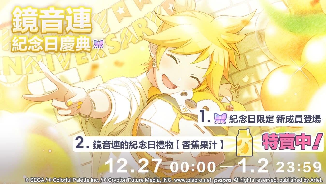 【🎂販售「[鏡音鈴/鏡音連]HAPPY ANNIVERSARY限定組合包」🎤】 尊敬的各位居民: 12/27 是鏡音鈴/鏡音連的紀念日,為慶祝鈴/連的紀念日,我們於12/27 0:00起在水晶商店販售[鏡音鈴/鏡音連]HAPPY ANNIVERSARY限定組合包,包含免費水晶、紀念日限定道具等內容✨ ■舉辦期間12/27 0:00 ~ 1/2 23:59 ※更多詳情請至遊戲內通知