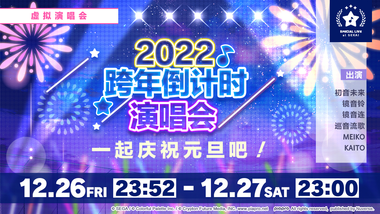 尊敬的各位「世界」居民:我们将于12/26(五)和12/27(六)举办「2022跨年倒计时 演唱会」。将会由六位虚拟歌手共同为大家带来精彩演出✨【场次及开放时间】12/26 23:5212/2701:00、02:00、08:00、12:00、18:00、19:00、20:00、21:00、22:00、23:00欢迎各位居民前往观看,一起庆祝元旦吧!祝愿各位居民度过美好的时光~💗今