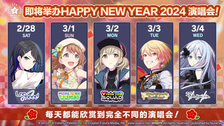 尊敬的各位「世界」居民:我们将于2/28(六)开始举办「HAPPY NEW YEAR 2024 系列演唱会」将由5个组合轮流为大家带来精彩演出💕 【场次及开放时间】 ・2/28 12:00 ~ 3/1 08:00 Leo/need💫・3/1 12:00 ~ 3/2 08:00 MORE MORE JUMP!☘・3/2 12:00 ~ 3/3 08:00 Vivid BAD SQUAD💿