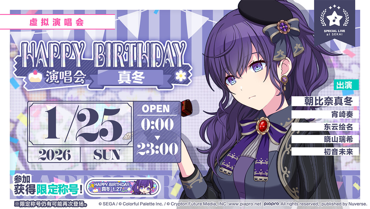 尊敬的各位「世界」居民:我们将于1/25(日)举办「HAPPY BIRTHDAY 演唱会 真冬 Stamp」。将会由25点,Nightcord见。与初音未来共同为大家带来精彩演出✨【场次及开放时间】1/2500:00、01:00、02:00、08:00、12:0018:00、19:00、20:00、21:00、22:00、23:00欢迎各位居民前往观看,一起庆祝真冬的生日吧!祝愿各
