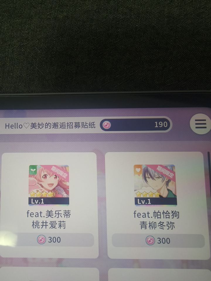 大佬你好,pjsk新人问下,刚玩这个游戏,辛辛苦苦攒了6万钻石,抽了19次10连。全抽了kt猫,花了5万7钻石,才抽满这6个角色,期间还有两个重复了,也不知道重复的能干嘛,能升星么?现在只剩下6000多钻了,这游戏爆率也太低了,我从玩到现在一个钻石都没花过,大佬们说让抽限定,这个三丽鸥是不是就算限定?然后抽完了,给了190个召唤贴纸,这个贴纸该换什么阿??