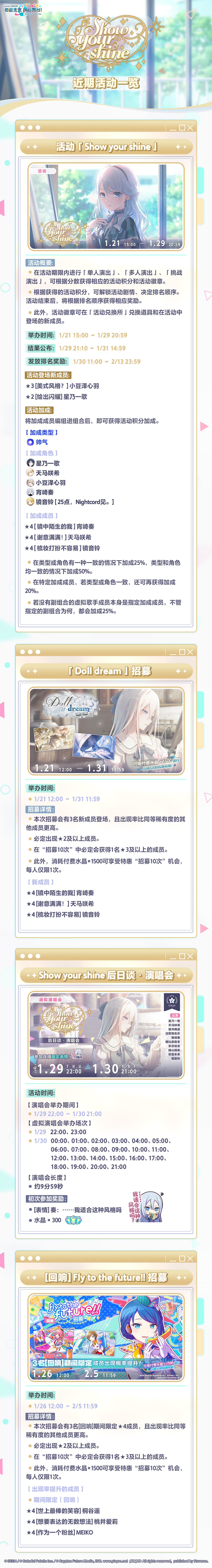 尊敬的各位「世界」居民:「Show your shine」将于后天(1月21日)正式开启!敬请查看相关活动一览。※更多活动详情,请点击下方图片查看。今后也请多多支持《初音未来:缤纷舞台》!立即前往「世界」>>>加入官方社群>>>QQ频道:搜索“初音未来:缤纷舞台”立即加入QQ4群:921716684QQ9群:554332731