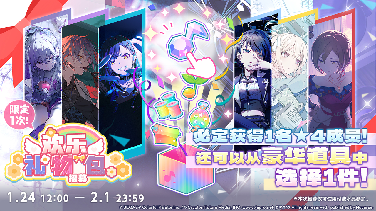尊敬的各位「世界」居民:我们将于1/24 12:00起举办「欢乐礼物包 招募」!“欢乐礼物包 招募”至少会出现1名★4成员。而且,进行招募可以一并获得所选择的道具。本招募为每人限定一次,可使用付费水晶×3000进行招募💕※详情请至游戏内通知查看。今后也请多多支持《初音未来:缤纷舞台》!立即前往「世界」>>>加入官方社群>>>QQ频道:搜索“初音未来:缤纷舞台”立即加入QQ4群: